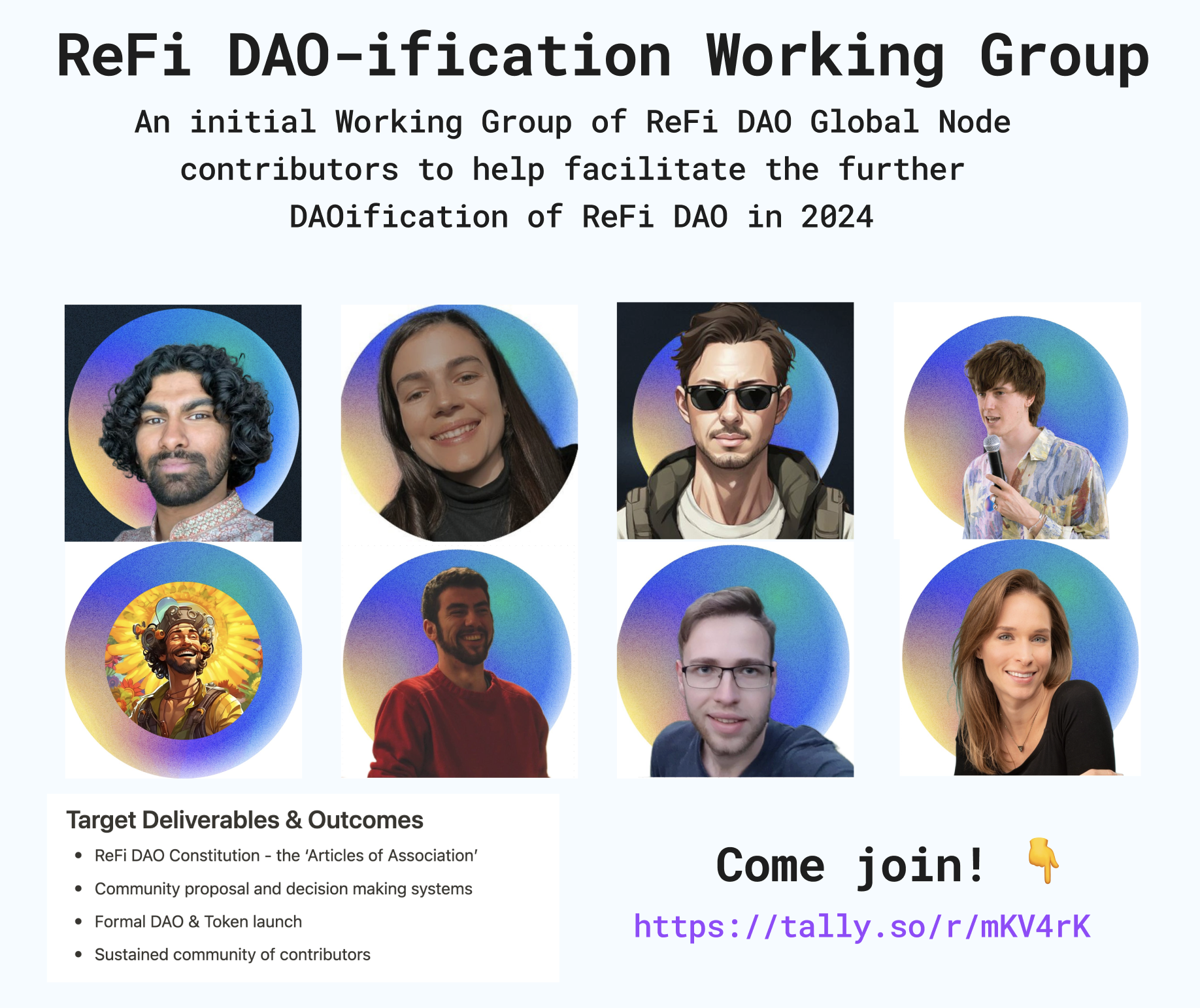 In order to help achieve these ambitious targets and initiatives we have formed an initial working group of global contributors to help facilitate key operations and drive the further DAOification of ReFi DAO in 2024.