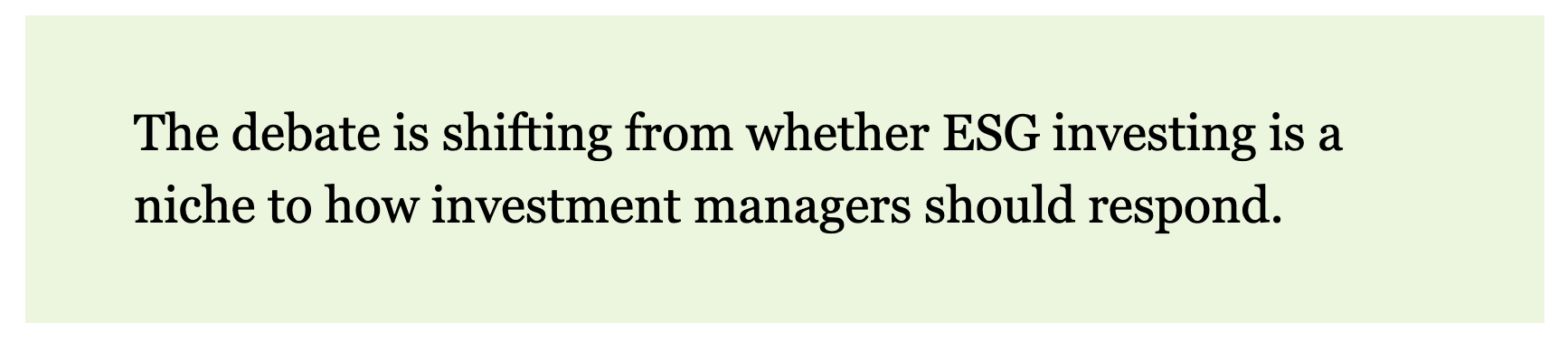 Broad investment into environmental, social and governance-focused (ESG) activities has continued to grow, spurred on by increasing regulatory attention to to these factors.