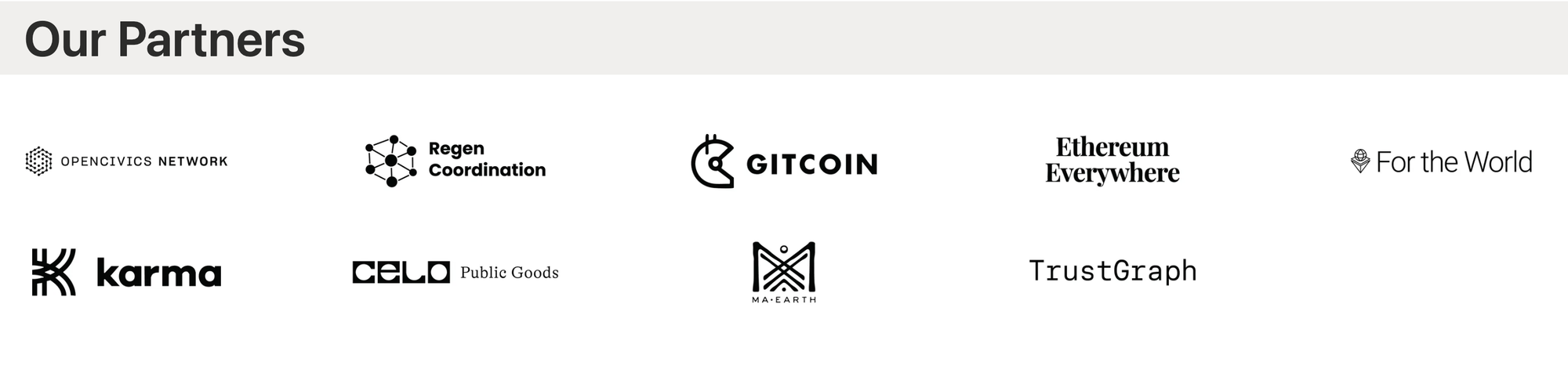 - Current Funders: Gitcoin, Celo Public Goods, Ma Earth, Ethereum Foundation / Ethereum Everywhere.