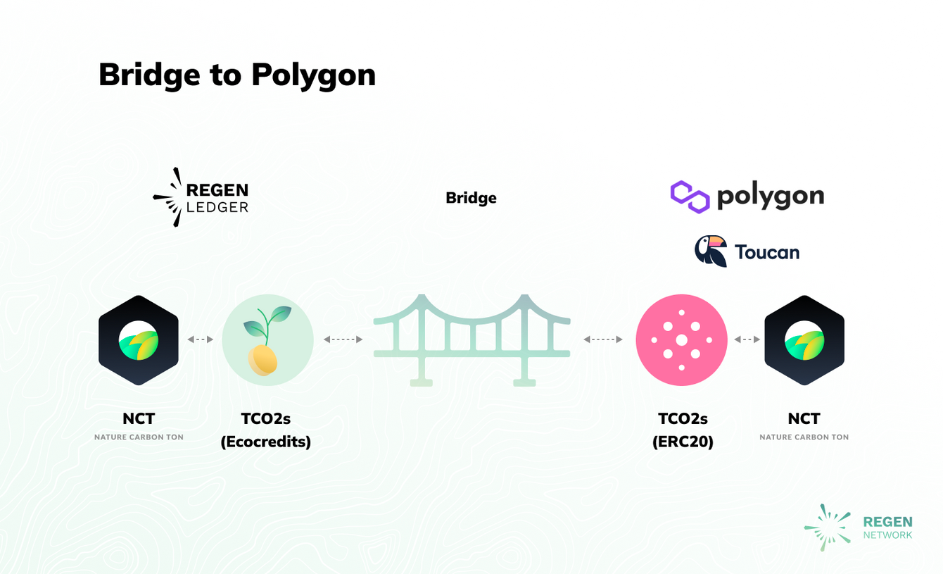 NCT is a carbon token backed by Verra's carbon credits, tokenized by Toucan Protocol, and now available to bridge between Regen Network and Polygon.